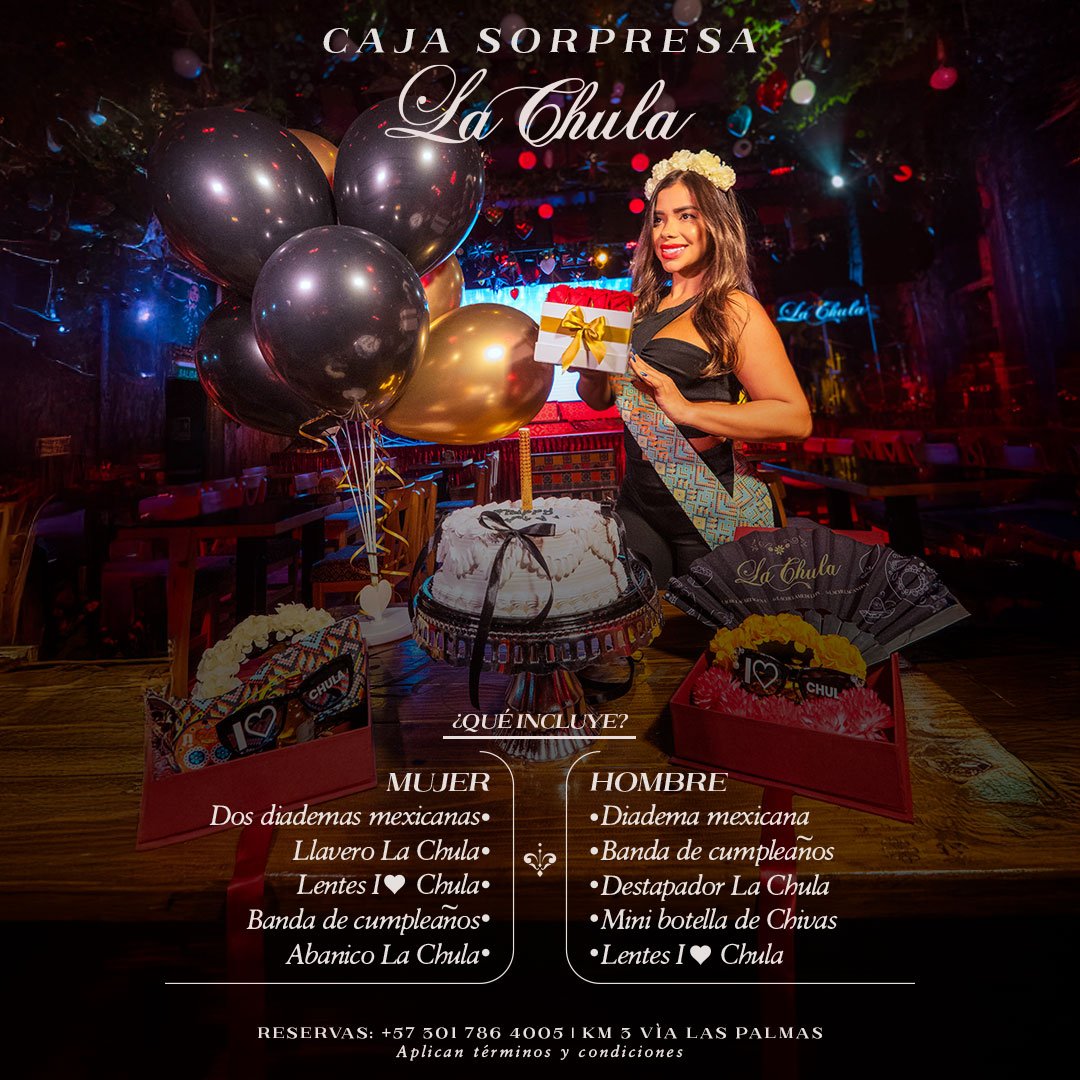 Para mujer: 2 diademas mexicanas, Llavero La Chula, Lentes I love Chula, Banda de cumpleaños y Abanico La Chula.